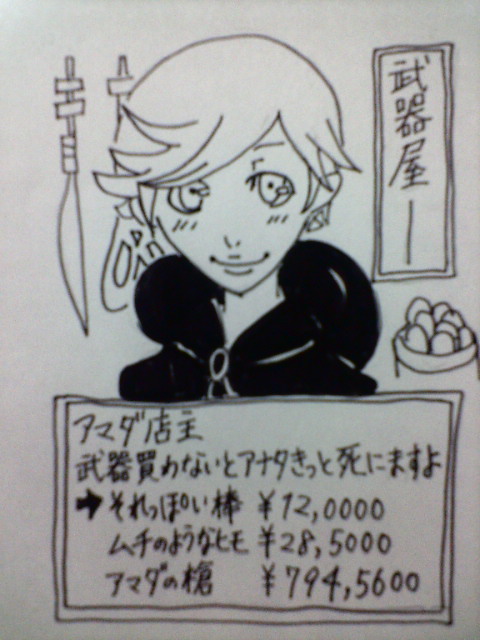ウタタネノヒトリゴト。ここは管理人・ウタタネが独り言を書き連ねているブログでございます。 ペルソナ中心サイトなのでブログもペルソナ関係(主に2、3)中心になるかもしれません。最近は鳥海氏関係の語りが多いです。 ※キーワード検索で来られた方は上記の点と、女性向き表現が含まれる場合があることを注意してください。 サイトURL【http://utatane.ebo-shi.com/】又は右のプロフィールからPAGE | 82 83 84 85 86 87 88 89 90 91 92 | ADMIN | WRITE 2006.10.13 Fri 01:13:03 なんとぉ!!2006.10.12 Thu 10:25:25 P3雑記おはよーございます。 サントラについて 2006.10.11 Wed 21:38:49 漫画の後はSSかなぁ~2006.10.10 Tue 22:56:40 第三弾ドラクエ風P3・RPG第三弾 一応終了~~ 可愛すぎて攻撃できない厄介な敵。(私が描いたコロマル多少怖めですが・・・) でもコロマルの方が普通に戦っても強い。え?ボスじゃねぇの? 可愛らしく微笑みながら武器押し売り。買わないと細木○子も真っ青なセリフを吐く。(トリッシュっぽいカンジ) しかも値段がハンパない。おススメはご自慢のアマダの槍 うん…ごめん…扱いひどくてゴメン。でも好きだよアイギス! …ごめんなさい。思いつかなかったんです… 2006.10.10 Tue 01:02:11 真伊同盟だぁよッ!!! |